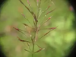 Its flowering stems are about 20 to 60 centimeters high and its leaves are linear-lanceolate and about 3 to 10 centimeters long by 4 to 6 centimeters wide. The panicles are purplish, open and with few whorled branches and can reach about 5 centimeters long, bearing few-flowered spikes. The sessile spikelet is very narrow, about 3 millimeters long. The callus is elongated and barbed and the fourth glume is linear, acuminate, and awned.