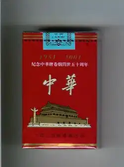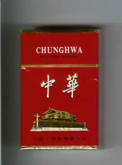 Chunghwa (simplified Chinese: 中华; traditional Chinese: 中華; pinyin: Zhōnghuá) is a Chinese cigarettes brand produced by the Shanghai Tobacco Group, a subsidiary of China Tobacco.[1][2] Chunghwa is marketed as a premium brand, the package design is a bright red color with the Tiananmen and its Huabiao pillars in gold on the front.[3] "Chunghwa", or Zhonghua (中华/中華), is one of the common names for China. As a result, advertisements usually use the name as a pun, though this practice has been controversial. For example, the slogan "Love Our Chunghwa" could also be translated as "Love Our China"[2] and could therefore be used as an advertisement.