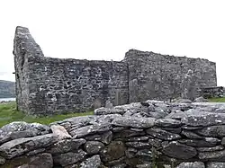 What remains today are church ruins, a graveyard with stone slabs, and three leachta (burial mounds). There are 11 cross slabs on the island; two slabs feature inscriptions.[4][5] One of the slabs has an inscription in Irish, along with alpha and omega Greek symbols, with a blessing on the monk Anmchad, who is supposedly buried on the island.[6] Of the three leachta in the cemetery, two feature tall pillar stones at the center, while the third is a low mound built from stone slabs. The church contains a rectangular block of sandstone with a 12th century engraving of a musician playing a bowed lyre. [5][7][8] The site is a National Monument in state care.[9]