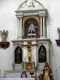 The choir area is large, extending over the back of the three naves and supported by three arches. The area is enclosed by a wrought iron railing with small bells which are originals. The tabernacle area is made of wood and contains an image of the Virgen de la Soledad, in a black robe with silver embroidery.[2][3]