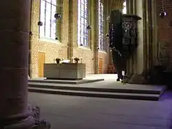 The interior was damaged by fire in 1944, but much less than the other medieval churches of the city. When the new organ was installed in 1953, the acoustics were so poor that in 1958 the city assigned Dieter Oesterlen to manage the church's refurbishment. The residual medieval plastering and the remains of the frescos were removed, leaving plain brick walls. In 1966, the French artist Alfred Manessier was charged with redesigning the 19 windows that had been destroyed during the Second World War. Inspired by verses from the Bible, he embarked first on the design of the four main windows, employing brightly coloured stained glass representations with expressive linear patterns. Together they depict various manifestations of the Word of God. At the end of the aisle to the north of the altar, the Christmas Window is inspired by "The Word became flesh" (John 1:14), while the Pentecost Window at the east end of the chancel is inspired by the Miracle of Tongues (Acts 2). The Sermon Window symbolises the preached word: "We are ambassadors for Christ" (2 Corinthians 5:20) while the Virgin Mary Window, a rose window at the opposite end of the church draws on the Christmas story: "Mary kept all these sayings, pondering them in her heart" (Luke 2:19).[5] With the assistance of François Lorin from Chartres, Manessier completed his work in 1979.[6]