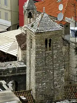 The Belltower of the Church of Our Lady of the Belfry (Croatian: Crkva Gospe od Zvonika u Splitu) is a disused Roman Catholic church in Split, Croatia. Built into a small space (an early guardhouse) within the ancient Iron Gate of Diocletian's western wall. Today little survives of the building, apart from the belltower, one of the oldest in Croatia.