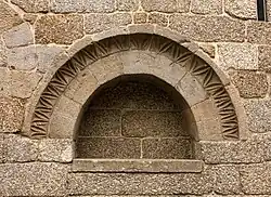 At the front left of the chapel is the baptismal font, made of granite in a simple circular form.[1] This baptistery is demarcated by an iron gate crowned in stylized fleur-de-lis. Alongside is a stone with inscription stating that the baptistery was used to baptize Afonso Henriques in 1106. Lateral porticos are carved into simple arches.[1] A full triumphal arch is decorated with frieze with interlocking ribbon motifs, while a cornice runs across the perimeter of the temple.[1]