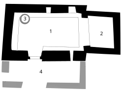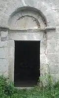 The nave is 8.70 m long and 5.80 m wide. The apse is a quadrilateral 4.50 m wide and 3.50 m deep.[33] The stonework is made up of roughly hammered rubble stones bonded with abundant lime mortar, reinforced at the corners with larger, more precisely-cut stones. The walls are very thick. The irregularity of the masonry, which is more pronounced in the apse than in the nave, suggests an earlier construction.[18] The stones used are of local origin, larger and more regular in the nave than in the apse.[27] The north wall houses two rectangular niches.[18]
