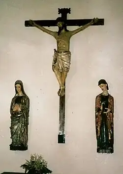 It is made of polychrome wood; the image of Christ Crucified measures almost two meters, and those of the Virgin and St. John reach 1.60 m. It is an artistic piece of great value, considered one of the best pieces of the heritage of the Church in Castilla y León, and was the main piece of the exhibition of Las Edades del Hombre entitled "Art in the Church of Castilla y León", held in Valladolid in 1988–1989. Because of this, it was restored in its entirety.
