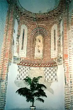 In the threshold, there are three prolonged brick apses, the main one being larger and more protruding, with two blind semicircular arcades in the middle; and in the upper one, two orders of windows with frames, separated by simple friezes of angled brick that are interrupted in the protruding panels. The lateral apses reduce their windows in favor of the upper arches and suppress the saw-toothed windows due to the lower overall height.[1]