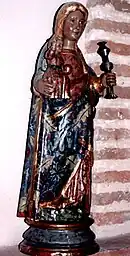 The Virgen de la Rochela is of late Gothic style and great artistic merit, her blonde hair and blue eyes make her unique in the region. Her gold-trimmed mantle still retains the original polychromy. It is of French origin, possibly from the city of La Rochelle,[7] and comes from the old convent of San Basilio, where it had an altar in the main chapel, on the Gospel side. Legend[8] has it that once in Cuéllar it was taken to the Dukes of Alburquerque, who, after drawing lots, deposited it in San Basilio.[9]