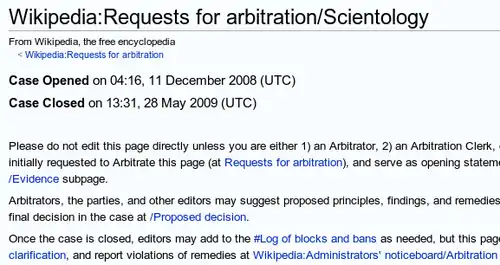 In January 2009, a case involving Scientology was brought before Wikipedia's Arbitration Committee. Wikipedia administrators presented evidence during the case that Church of Scientology-controlled computers were used to promote the organization, using multiple user accounts. One user, going by the pseudonym "COFS", admitted this pattern of editing and stated the edits from Scientology computers would continue. In May 2009, the Arbitration Committee decided to restrict editing from IP addresses belonging to the Church of Scientology to prevent biased edits. The decision meant that Church of Scientology-controlled IP addresses received the same blockable status as open proxies on the site. Many Scientology critics were also banned; the committee concluded that both sides had "gamed policy" and resorted to "battlefield tactics", with articles on living persons being the "worst casualties" of edits.[5][6] On 7 January 2022, the rule of IP addresses owned by Scientology being blocked as if they were open proxies was lifted.[7]