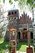 The church was built in the style of a mediaeval castle or manor house[2] using stone and brick[1] and the roof was of Polish red tiles. The belfry had three bells, the largest of which weighed 150 kg.[6] The doors were massive and forged[2] and the windows were glazed with colored stained glass, there were wall paintings, and a crystal chandelier hung in the middle of the sanctuary.[7] The acoustics were excellent.[2]