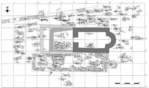 The materials of the walls are almost entirely made from river pebbles attached with a mortar binder. They were reinforced with wooden crossbars (beams of square cross section, from 15×15 centimeters to 18×18 centimeters) which were located inside the structure of the wall mass. Two parallel beams were placed in horizontal lines with a distance between them of 0.7 to 0.8 meters vertically. On the outer face of the wall, the crossbars appear only under the roof cornice and form the base of both gables. From the inside part of the wall, outer beams are covered only with a layer of fresco plaster. In the western wall, there is an entrance with a stone threshold and shallow jambs. The architrave lintel consists of a series of beams of square cross sections and in that frame there was once a wooden structure with double-winged doors.[7]