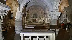 The crypt underneath St Mary's, has walls that are 3 feet (0.91 m) thick.[20] It is reputed to be the only crypt in England that has a nave, apse and side aisles.[21] The crypt also lays claim to be the oldest Norman crypt in the world and additionally the only one with a nave, aisles and an apsidal chancel.[22] The crypt runs underneath the whole footprint of the church above and is furnished with one square shaft which is indented with a piscina. The crypt is supported by four pillars believed to be of pre-conquest in origin and historians estimate that the crypt has not been altered since the time of William the Conqueror.[23] The crypt is accessed by a staircase descending from nave.[16] During the 18th century, cock-fighting was said to have taken place in the crypt, with or without the knowledge of the clergy and churchwarden.[24]
