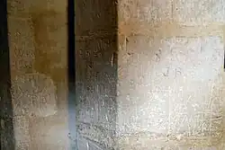 The church has a great deal of graffiti from various eras. On the first pier of the North arcade in a small 15th-century hand is scratched "hic est sedes Margarete Tayl . . d" (possibly done by Margaret, wife of Walter Taylard who rebuilt the adjoining North chapel). On the third pier of the North arcade can be found a possibly medieval drawing of three small houses perhaps along a street. On the second pier of the South arcade in bold characters is scratched in a late medieval hand "mors cõparat / umbre que / semper / sequitur / corpus". On the North splay of the West window of the tower in a bold 16th-century hand can be found "Th[om]as [?Jek]yll Clar[ke] of Ga[m]ly[n]gaye".[1][2]