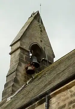 The bellcote contains two bells. The larger one, original to the church and measuring 20 inches (51 cm), was founded in 1879 by Mears and Stainbank. It is hung for use with a bellrope, being in its original position within the bellcote, with a full metal wheel. The smaller one is connected to the clock, which as of 2016 was awaiting repair. This bell measures 14 inches (36 cm) and was founded by John Taylor of Loughborough, possibly in the 1930s when the turret clock mechanism was installed. It has been added at a lower level on the east side of the bellcote, and is struck by a clock hammer. Both bells are inscribed with the maker's name, and the larger one has the date 1879.[14] The clock bell, clock face and turret mechanism by Potts of Leeds was donated by the daughters of George Lewis, who died aged 91 in 1932, having served as churchwarden for 41 years.[15]