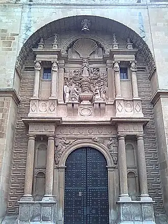 Construction of the church at this site in the then-expanding town was chosen in 1524. A number of architects including maestro Marquina, Maestro Pedro, Maestro Juan de Aranguren, Juanes de Segura, and Juan de Urrea took the work to 1579. The late-Renaissance portal has a relief depicting the Annunciation and Assumption of the Virgin. The façade was started in 1619-1624 by Francisco de Figuerola. Work continued on the sacristy, various chapels, and the bell-tower into the later half of the 18th century. From 1789 to 1805, Bartolomé Rivelles worked on the apse. The interior was decorated in Neoclassical style. Restoration took place in the 1980s.[1]