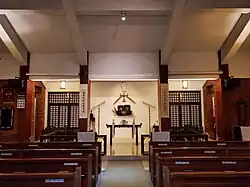The sanctuary and the adjoining traditional Chinese courtyard (siheyuan) was built following traditional Hokkien architecture and designed by Su Hsi Tsung. It is the only church in Taiwan built in this style. This style is extremely rare for church buildings in the world, even in Asian Church architecture. In this architectural style the main hall of the building, traditionally used as a family temple, is located opposite the entrance as is the sanctuary of the Church of the Good Shepherd. A Church of the East cross, as depicted on the Nestorian Stele, hanging above the altar. This reflects the aim of the church ever since its early days to contextualise the Christian faith into Chinese culture.[16]