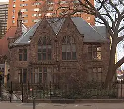 The church was erected in 1881 to designs by Theophilus Parsons Chandler. When the congregation diminished, the church closed in the mid-1980s, and the structure was reused in 1989 as office space. The National Trust for Historic Preservation profiled the structure as a good example of adaptive reuse: "The congregation worked closely with the buyer of the property, the Preservation Fund, and the Philadelphia Historical Commission to devise a design that would be sensitive to the historic fabric." The project "added two floors for office space and enclosed the interior space facing the chancel with a floor to- ceiling glass wall. Updated HVAC, electrical systems, and emergency equipment installed." "In an area of many churches, the successful conversion to office space was a welcome sight for many of the neighbors who had feared an abandoned church building."[2]