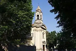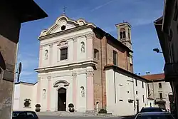 The bell tower does not rest on the ground but rises from the center of the tripartite façade.[32] Originally the façade was made of exposed brick: its present appearance dates from 1933. Inside it has three naves and a square chancel. Some 18th-century paintings are also preserved there.