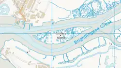 Cindery Island is at the mouth of Brightlingsea Creek (off the town of Brightlingsea) on the east coast of England in the county of Essex.