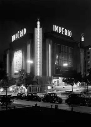 Cinema Império was one of the most prestigious and largest cinemas in Lisbon. It had 1,676 seats in stalls, and two balconies, with a restaurant in the basement with murals by Dourdil. In 1972 a second screen, known as the Studio, was opened on the top floor. The cinema ceased operation at the end of 1983 because of competition from television and the proliferation of multi-screen cinemas in shopping centres.[2][4][5]