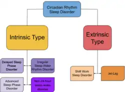 CRSDs can be categorized into two groups based on their underlying mechanisms: The first category is composed of disorders where the endogenous oscillator has been altered, known as intrinsic type disorders. The second category consists of disorders in which the external environment and the endogenous circadian clock are misaligned, called extrinsic type CRSDs.[18]
