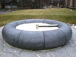 Circle consists of a granite curved circle (reminiscent of a donut or liferaft) with an open center filled with a sandbox.[2] A pole comes from the center of the artwork with a metal arm with triangular teeth placed in a row on the bottom part of it. It turns around in the sand, like a zen garden, with sounds going on and off periodically.