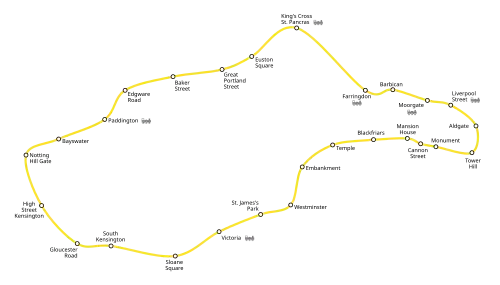 - ^ For example the 22:26 outer rail (clockwise) service from Aldgate was booked to arrive back at Aldgate at 23:22 after waiting at Gloucester Road (for 1+1⁄2 minutes), Edgware Road (2+1⁄2 minutes) and Baker Street (1⁄2 minute).[33]