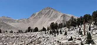 Cirque Peak is a 12,900-foot-elevation (3,900-meter) mountain summit located on the crest of the Sierra Nevada mountain range in California.[4] It is situated on the common border of Tulare County with Inyo County, as well as the shared boundary of Golden Trout Wilderness and John Muir Wilderness, on land managed by Inyo National Forest. It is 14 miles (23 km) southwest of the community of Lone Pine, 7.7 miles (12.4 km) south-southeast of Mount Whitney, and 3.2 miles (5.1 km) south of Mount Langley, the nearest higher neighbor. Cirque Peak is the highest point of the Golden Trout Wilderness, and ranks as the 175th highest peak in California.[5] Topographic relief is significant as it rises 1,800 feet (550 meters) above Cirque Lake in approximately one mile. The Pacific Crest Trail traverses the southwest slope of this mountain, providing an approach option. The mountain was apparently named in 1890 by Joseph Nisbet LeConte and companions who noted the remarkable cirque on the north aspect.[6]