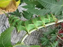 Caterpillars are quite large, as with many others in the Citheronia genus, and are prominently green, with long prolegs that sport black 'racing stripes' and red 'horns' along each segment of their body. They also have an alternating pattern of a black stripe on each segment, that terminates at the spiracle (arthropods). Their dorsal side is darker green than their ventral side.