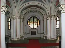 The statue of the founder of the House, the prince Árpád was placed in the middle of its central rizal.[1] The Kecskemét people, who were initially averse to the new town hall, called Árpád the Árpádka armor-plated warrior. Portraits in relief of Nikola IV Zrinski, Emeric Thököly, Matthias Corvinus, John Hunyadi, Stephen I of Hungary, Franz Joseph I of Austria are placed in the building. Outside and inside the building, are located the coats of arms of Kecskemét and Hungary.[1]
