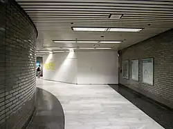 The BART Board approved the name "Civic Center" in December 1965.[5] BART service at the station began on November 5, 1973, followed by Muni Metro service on February 18, 1980.[6][2] In 2005, the station name was changed to Civic Center/UN Plaza during celebrations for the 60th anniversary of the United Nations and World Environment Day.[7][8] Additional fare gates to allow direct connections between Muni and BART (without having to go up to the fare mezzanine) were also proposed.[8] Construction of a bike station on the mezzanine level began in December 2014; it opened in August 2015.[9][10]