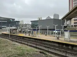 Civic Center station, originally Kiel station (for the Kiel Center under construction when the station opened), is a light rail station on the Red and Blue lines of the St. Louis MetroLink system.[3] This below-grade station is located near 14th and Spruce streets near Interstate 64. It is the primary transfer station for MetroBus and serves regional bus routes operated by Madison County Transit. Additionally, the station adjoins the Gateway Transportation Center which has intercity services provided by Amtrak, Greyhound, and others.