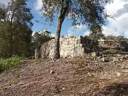 The entrance that interrupted the wall was paved with flagstone with about 1.70 metres (5 feet 7 inches) of width. The defensive perimeter seems to include a ditch of about 1 metre (3 feet 3 inches) of depth and width in base of the hill, as it was detected while a house was being built in the north of the hill.