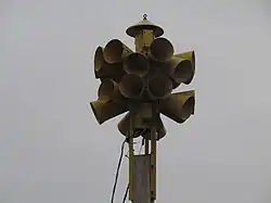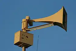 Electronic sirens consist of an electronic tone generator, a high-power amplifier, and a horn loudspeaker. Typically, the loudspeaker unit incorporates horn loading, causing them to be similar in appearance to some electromechanical sirens. Many of these loudspeakers incorporate a vertical array of horns to achieve pattern control in the vertical plane. Each cell of the loudspeaker horn is driven by one or more compression drivers. One type of compression driver for this type of loudspeaker uses two doughnut-shaped permanent magnet slugs to provide magnetic flux. For siren applications, high-fidelity sound is a secondary concern to high output, and siren drivers typically produce large amounts of distortion which would not be tolerable in an audio system where fidelity is important. Most newer (and some older) electronic sirens have the ability to store digital audio files. These audio files could be custom sounds, or emergency messages.[14] Depending on the situation, the stored sound file can broadcast through the siren.[15] These sirens could also come with a Microphone Jack to broadcast live messages via microphone.[16]