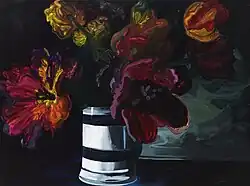 Clare Woods RA is a British painter who lives and works in Hereford in the Welsh borders in the UK.[1] Originally trained as a sculptor, Woods career as a painter spans 30 years. Painting initially with gloss paint, the artist now works predominantly with oil based paint on aluminium, and creates smaller works on paper. Woods is well known for her large scale abstracts landscapes, more recently exploring themes with reference to historical art practice, including flowers in the tradition of memento mori, and increasingly figurative subjects, including her first self-portrait.