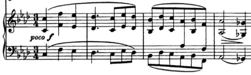 The second movement is in ternary form. The clarinet introduces a simple descending theme decorated with turns. The piano writing is sparse in the first theme area. This A section is repeated twice, once ending on a half cadence and the other with a perfect authentic cadence on the home key of A♭ major.