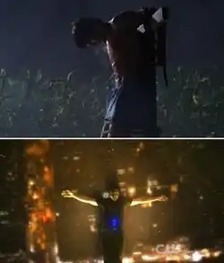 This was extended to the end of season nine, where Clark sacrificed himself to send General Zod and the rest of the Kandorians to their own world. In doing so, Clark fell off a building "... in full crucifixion pose, driving home the point that he is sacrificing himself for the good of the planet".[71] To this point, Cinefantastique's Tom Powers suggested that these images and metaphorical emphasis through dialogue exchanges came across so heavy-handed that a very devout individual might have found them offensive.[72]
