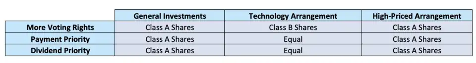 Some companies value their Class A shares at extremely high prices. Although these Class A shares are publicly owned and traded on the market, they are generally out of reach for the typical investor. In these cases, firms create Class B shares which trade at a mere fraction of the Class A’s share. The Class B share, however, has only a small fraction of voting power. These companies create both share classes in a way where price and voting power are not proportional. One example of this arrangement is the Berkshire Hathaway structure.[31]