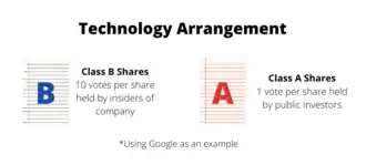 The technology class arrangement derived its name from its popularity amongst technology companies. It usually involves insiders of a company having control over their Class B shares. The Class B shares have about 10 times the voting power of Class A shares, and are not traded on public exchanges. These shares are called "super-voting shares" as they give key company insiders larger control over the company which includes its board and is usually the deciding factor for corporate actions.[32] Hence, the "super-voting shares" are usually not publicly traded.[33] One popular example would be the "Google Share Class Structure".[31] The purpose of this structure is argued to ensure stability of the company and prevent the board and management from feeling short-term pressure, which in turn allows them to focus on long-term goals.[34]