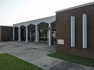 The Clay County Courthouse, Eastern District is located at Courthouse Square in the center of Piggott, one of two county seats of Clay County, Arkansas (the other is Corning). It is a single-story masonry structure, built out of concrete with brick facing. The main facade is symmetrical, with a recessed entrance area sheltered by a portico with a zigzag roof. The courthouse was built in 1966–67 to a design by Donnellan & Porterfield, replacing an 1890s Romanesque courthouse designed by Charles L. Thompson. Both this courthouse and that in Corning were built in the wake of a fire which destroyed the old Corning courthouse, and both were designed by Donnellan & Porterfield. Both are locally prominent examples of New Formalism style of Modern architecture.[2]
