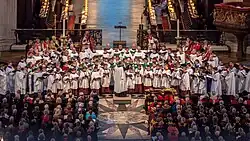The annual Festival service at St Paul's Cathedral, which began on 8 November 1655, has continued ever since, and is a major event annually in the calendar of the charity and of the cathedral.[23] Senior clergy and City figures, including the Lord Mayor of London or their representative, are usually involved in the event, and in the life of the charity, with the Archbishop of Canterbury, Archbishop of York and Bishop of London serving as Presidents.[24] With two cathedral choirs joining the choir of St Paul's, and with several composers such as Charles Villiers Stanford, Hubert Parry and Edward Elgar having written pieces for the event, the Festival is now one of the oldest and best known choral events in the Anglican Communion.[25]