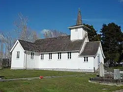 The first bridge across the Wairoa River was constructed by the early 1860s from timber.[14] In 1865, 150 new immigrants from Scotland on board the Viola arrived at Wairoa, settling around the former Ōtau kāinga. The allotments were not sufficient to sustain a village, and the immigrants gradually moved away or closer to the settlement near the Wairoa Bridge.[14] In 1866, the settlement changed its name to Clevedon. The name was chosen by local residents C.W. Stephens and Le Gally, named after the town of Clevedon in Somerset, England, where Le Gally . Many of the early settlers were Scottish, and had difficulties adopting the name.[17] All Souls Church, built in the Selwyn style and located in Clevedon, is registered by Heritage New Zealand as a Category II structure, with registration number 682.[18][19] Dairy farming became the major industry in Clevedon until the 1900s.[14]