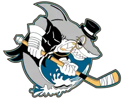 The team logo, a shark holding a hockey stick, was originally designed as an alternate logo for the San Jose Sharks before being modified with a top hat, a monocle, and formal wear for the Barons.