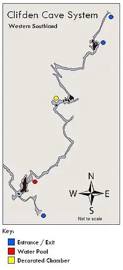 The cave system runs about 300 metres (980 ft). A marked through route with fixed ladders is available for properly equipped people who wish to experience caving, and other passages are accessible for experienced cavers.[2]