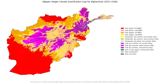 Since 1950, temperatures in Afghanistan have risen by 1.8 °C.[21][22] This has led to massive droughts which will continue to worsen.[23] Severe drought conditions affect 25 of the country's 34 provinces, impacting over half of the population.[24]