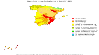 Climate change has caused temperatures in the world to rise in the last few decades, and temperatures in Europe have risen twice as fast as the average change in the rest of the world.[1] In Spain, which already has a hot and dry climate, extreme events such as heatwaves are becoming increasingly frequent.[2][3] The country is also experiencing more episodes of drought and increased severity of these episodes.[4] Water resources will be severely affected in various climate change scenarios.[5] Also, the mediterranean climate (Köppen: Csa), as well as other temperate climates in the country, is becoming less and less common, being replaced by the semi-arid climate (Köppen: BSk/BSh) and even the expansion of desert regions. Some forecasts indicate that the semi-arid climate will be the most common in Spain by 2050.[6]