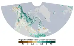 Climate change is expected to have a strong effect on the Arctic's flora, some of which is already being seen.[83] NASA and NOAA have continuously monitored Arctic vegetation with satellite instruments such as Moderate Resolution Imaging Spectroradiometer (MODIS) and Advanced very-high-resolution radiometer (AVHRR).[84] Their data allows scientists to calculate so-called "Arctic greening" and "Arctic browning".[85] From 1985 to 2016, greening has occurred in 37.3% of all sites sampled in the tundra, whereas browning was observed only in 4.7% of the sites - typically the ones that were still experiencing cooling and drying, as opposed to warming and wettening for the rest.[86]
