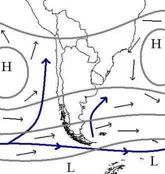 Prevailing winds, sea currents and stationary cyclones near Chile