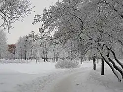 At the same time, the winters of 2009/2010 and 2010/2011 were colder than normal and turned out to be unusually snowy.[14] For example, during the period of December 21-26, 2009, 69 mm of precipitation fell in the form of snow, which is more than 1.5 monthly norms.[15] And by the beginning of March 2011, the snow cover reached 73 cm, breaking the record of 1966 (68 cm).[16] In addition, the second decade of February 2011, with an average temperature of -19.5 °C for 10 days, became the coldest in the history of observations.[17]