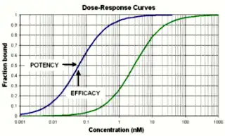 Drug potency is the measure of binding strength between a drug and a specific molecular target, whereas drug efficacy describes the biological effect exerted by the drug itself, at either a cellular or organismal level. Because drugs range widely in their potency and efficacy, drugs have been categorized on the spectrum of agonists and antagonists. Agonists bind to receptors and elicit the same effects as an endogenous neurotransmitter. For example, morphine is an agonist of the opioid receptor family. Conversely, antagonists bind to a receptor and elicit no cellular change.[2] Naloxone, an antagonist of the opioid receptors, exerts a biological effect only be interfering with endogenous neurotransmitter (morphine) binding.[2] Inverse agonists bind to receptors and elicit the opposite effect that an agonist would. The spectrum of drug continuum also includes partial agonists and partial inverse agonists, which comprise the wide majority of neurological clinical treatments. The ultimate clinical effect of a drug can be analyzed with a dose-response curve.[1]