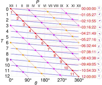 In this graphical solution, T denotes time in hours; P, hands' positions; and θ, hands' angles in degrees. The red (thick solid) line denotes the hour hand; the blue (thin solid) lines denote the minute hand. Their intersections (red squares) are when they align. Additionally, orange circles (dash-dot line) are when hands are in opposition, and pink triangles (dashed line) are when they are perpendicular. In the SVG file, hover over the graph to show positions of the hands on a clock face.